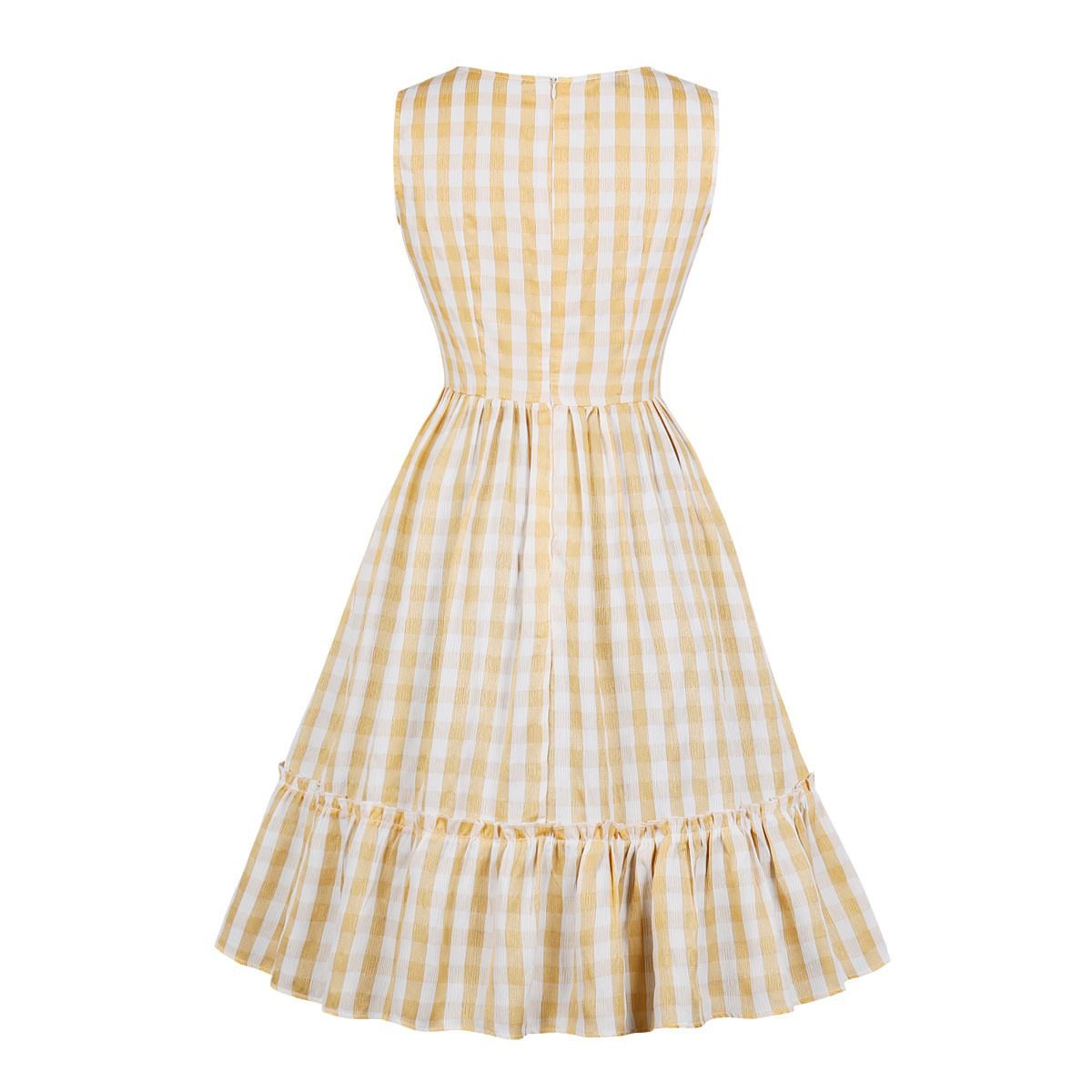 This vintage‑style plaid dress is a sweet recreation of the classic 1950s summer silhouette — fitted through the bodice, flared through the skirt, and finished with a soft ruffled hem that adds movement and charm. The gingham‑style plaid pattern gives it that timeless retro feel, making it perfect for warm days, picnics, casual outings, or anyone who loves the playful femininity of mid‑century fashion.
