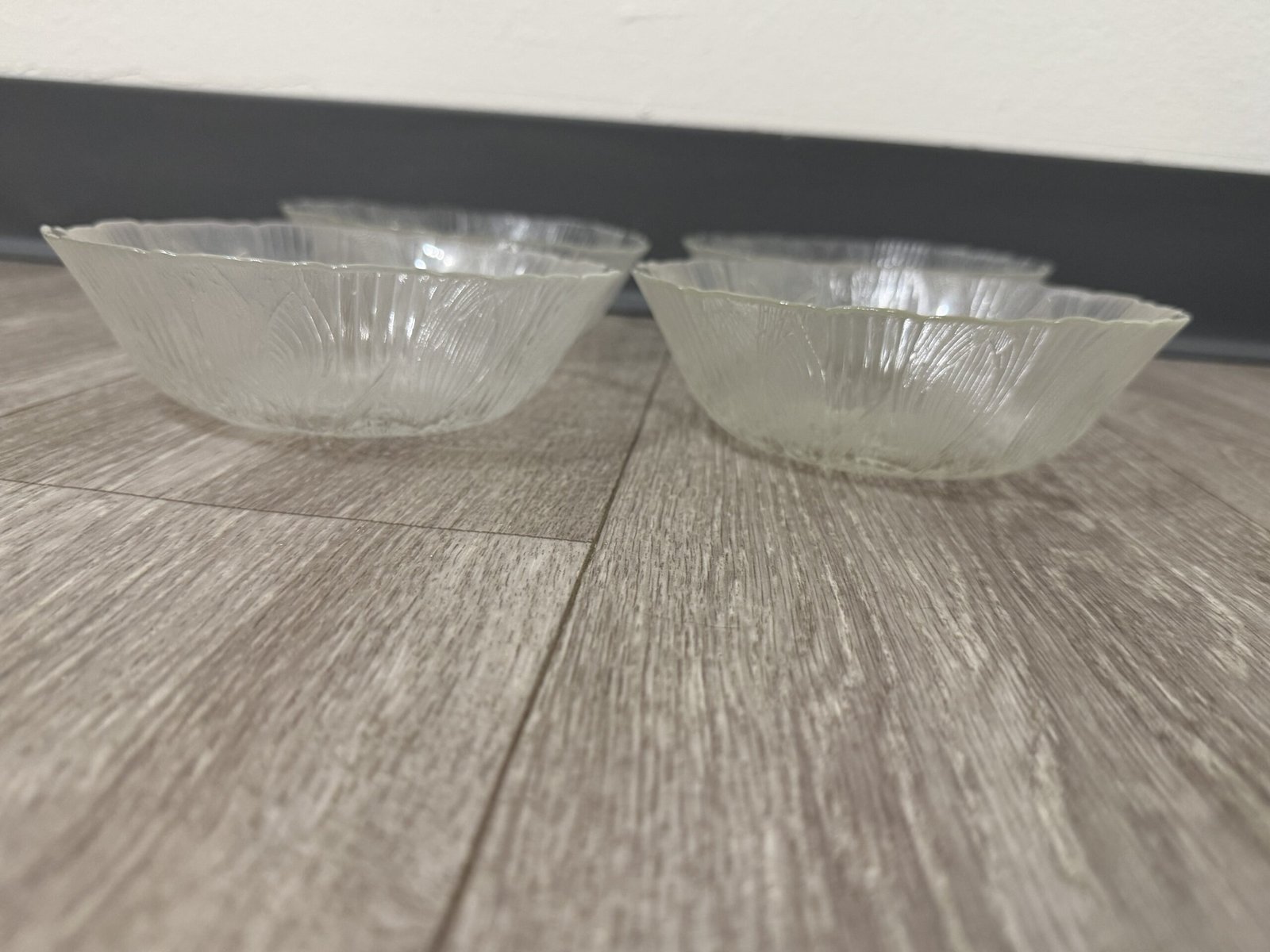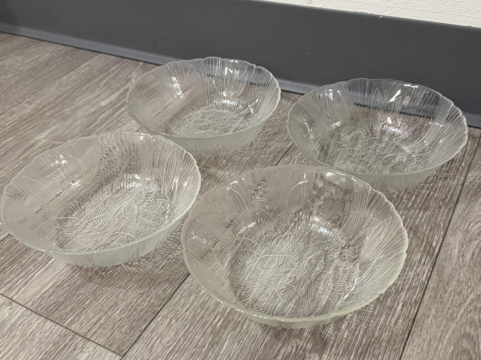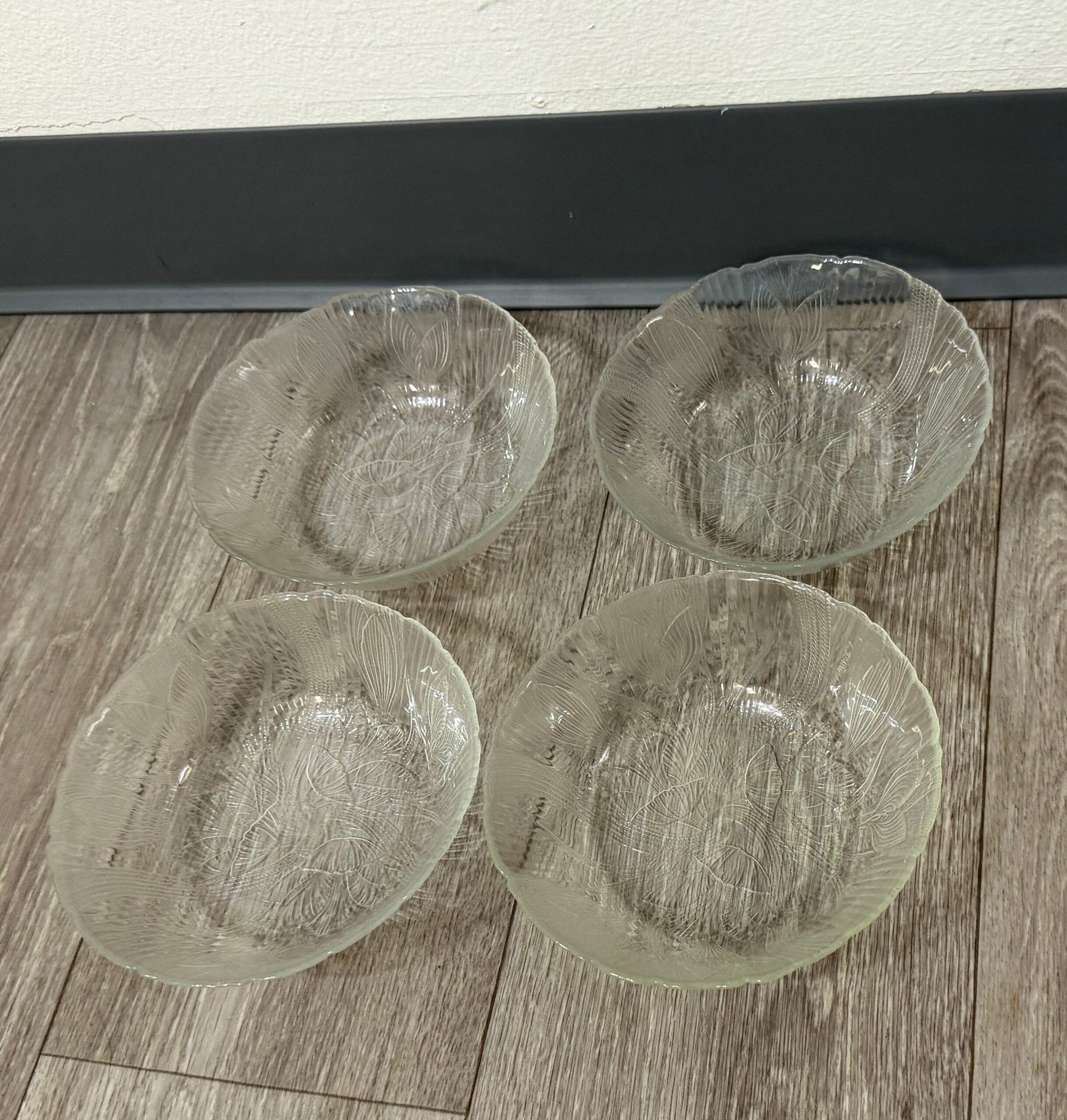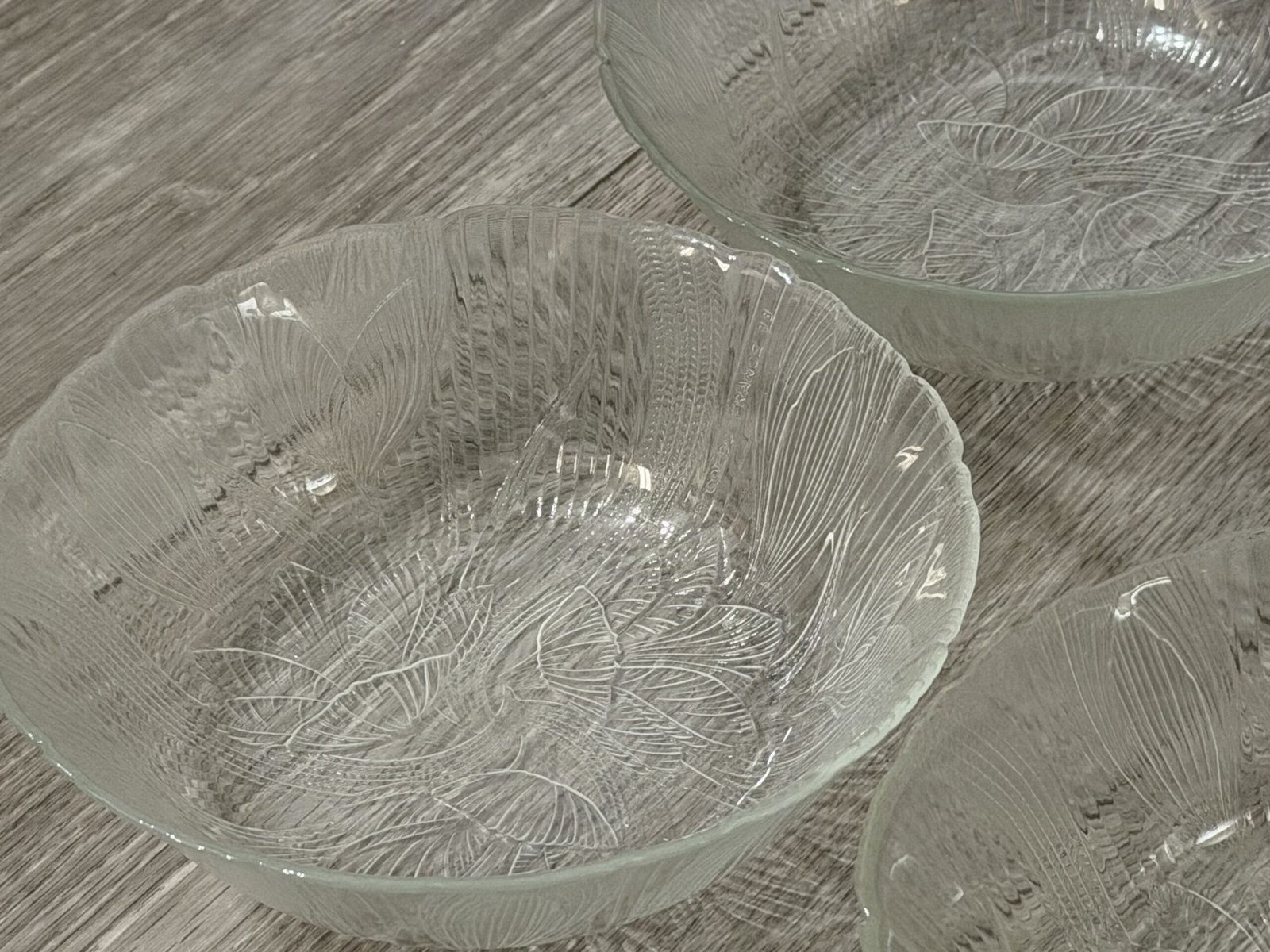 These vintage clear glass salad bowls feature the classic Crocus (Canterbury) pattern with raised floral motifs and fine vertical ribbing that beautifully catch and reflect the light. The set includes four matching bowls, perfect for serving salads, fruit, desserts, or for adding a touch of nostalgic charm to your cottagecore or retro-inspired table. Each bowl has a softly scalloped rim and pressed glass texture that feels both delicate and durable, making them ideal for everyday use or special gatherings in your Just Bee Mee collection. These bowels have a diameter of about 6.25”. See images for details.