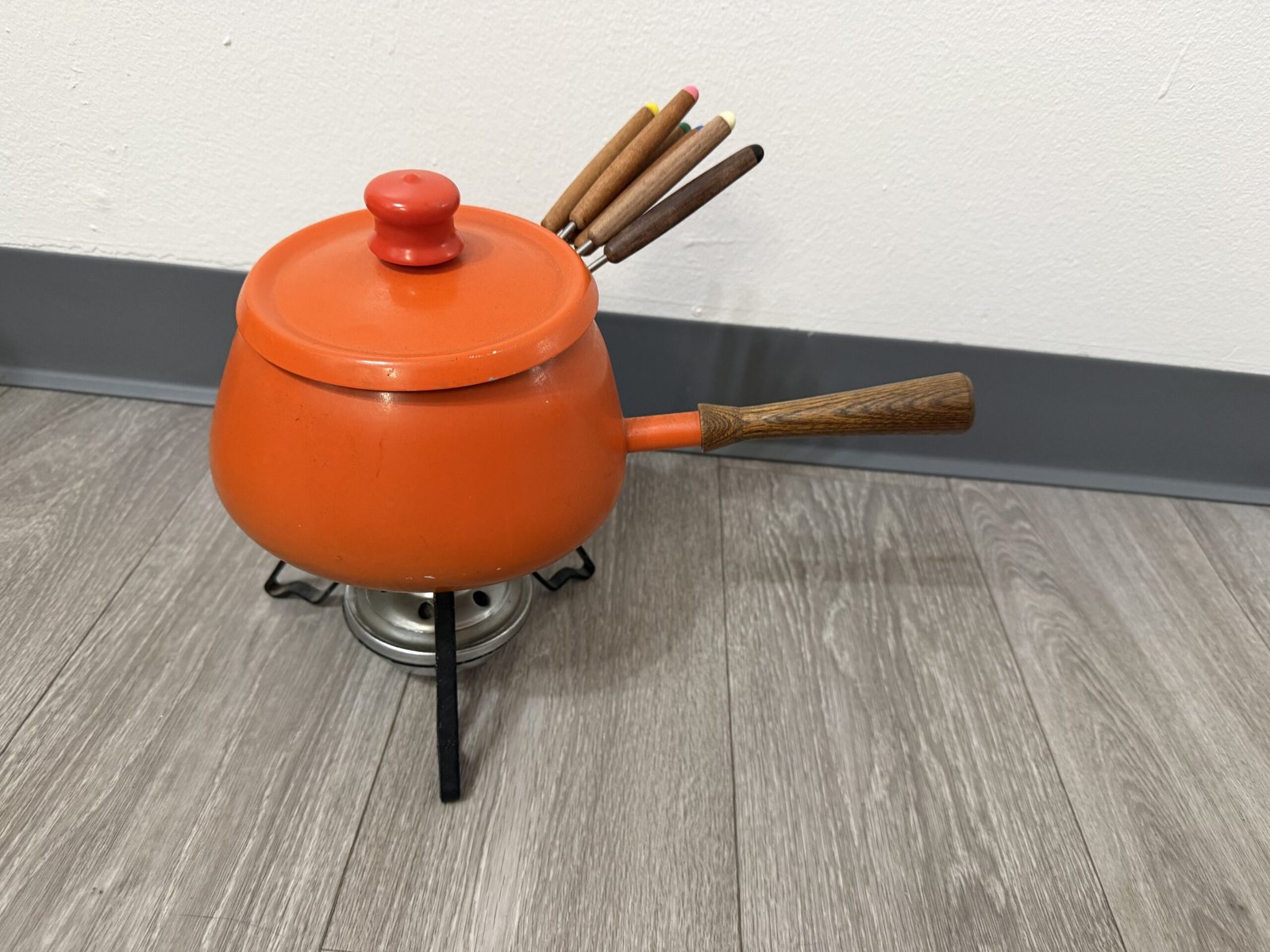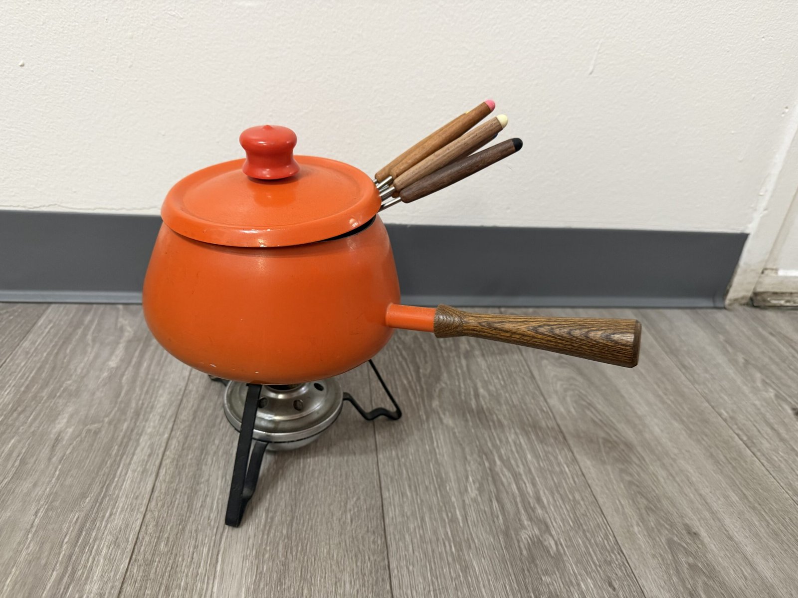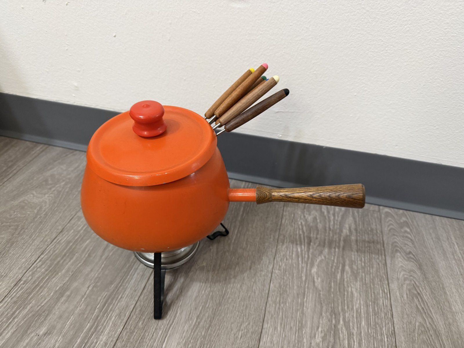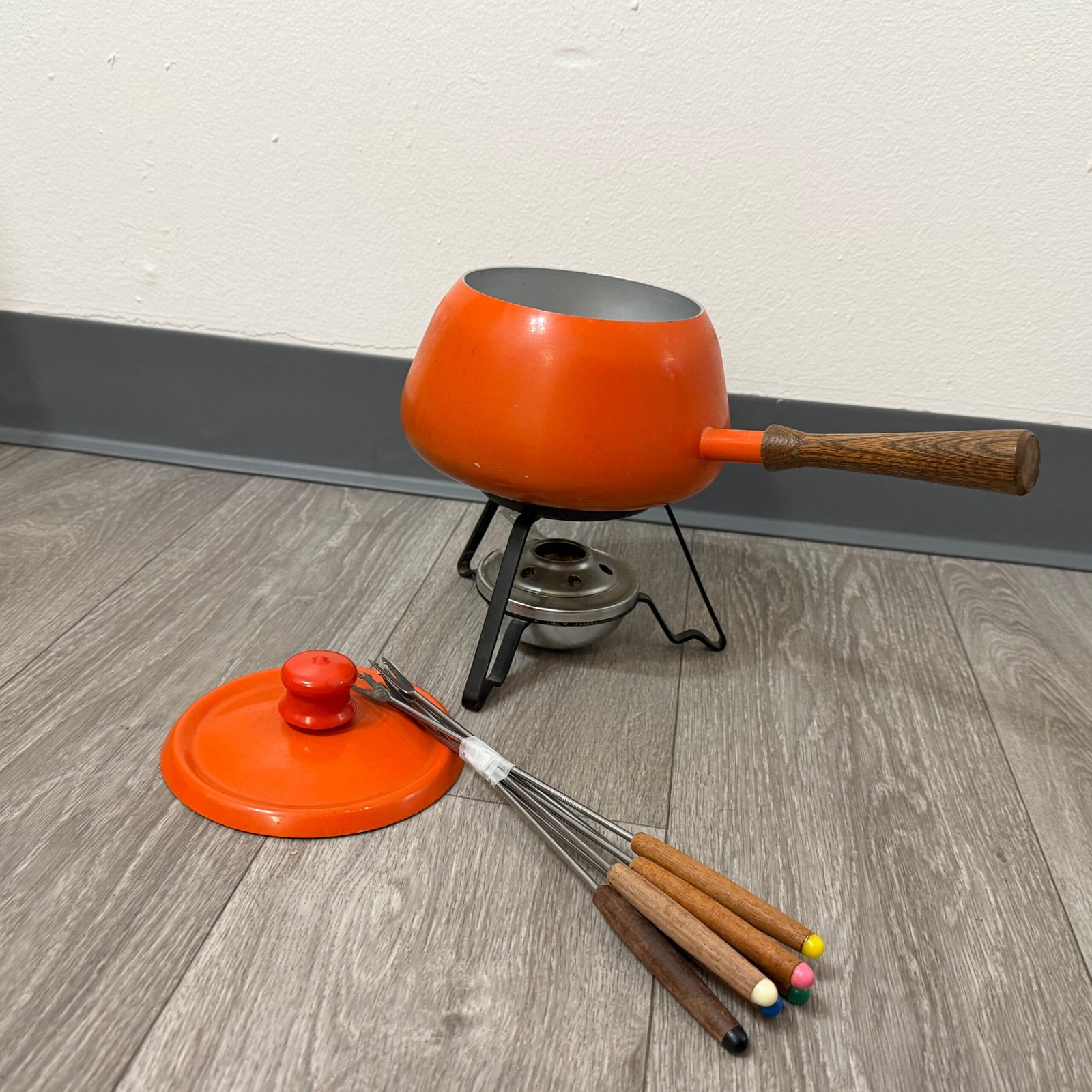 1960s orange enamel fondue set with forks and burner; inner rim is razor sharp and can cut—handle carefully.