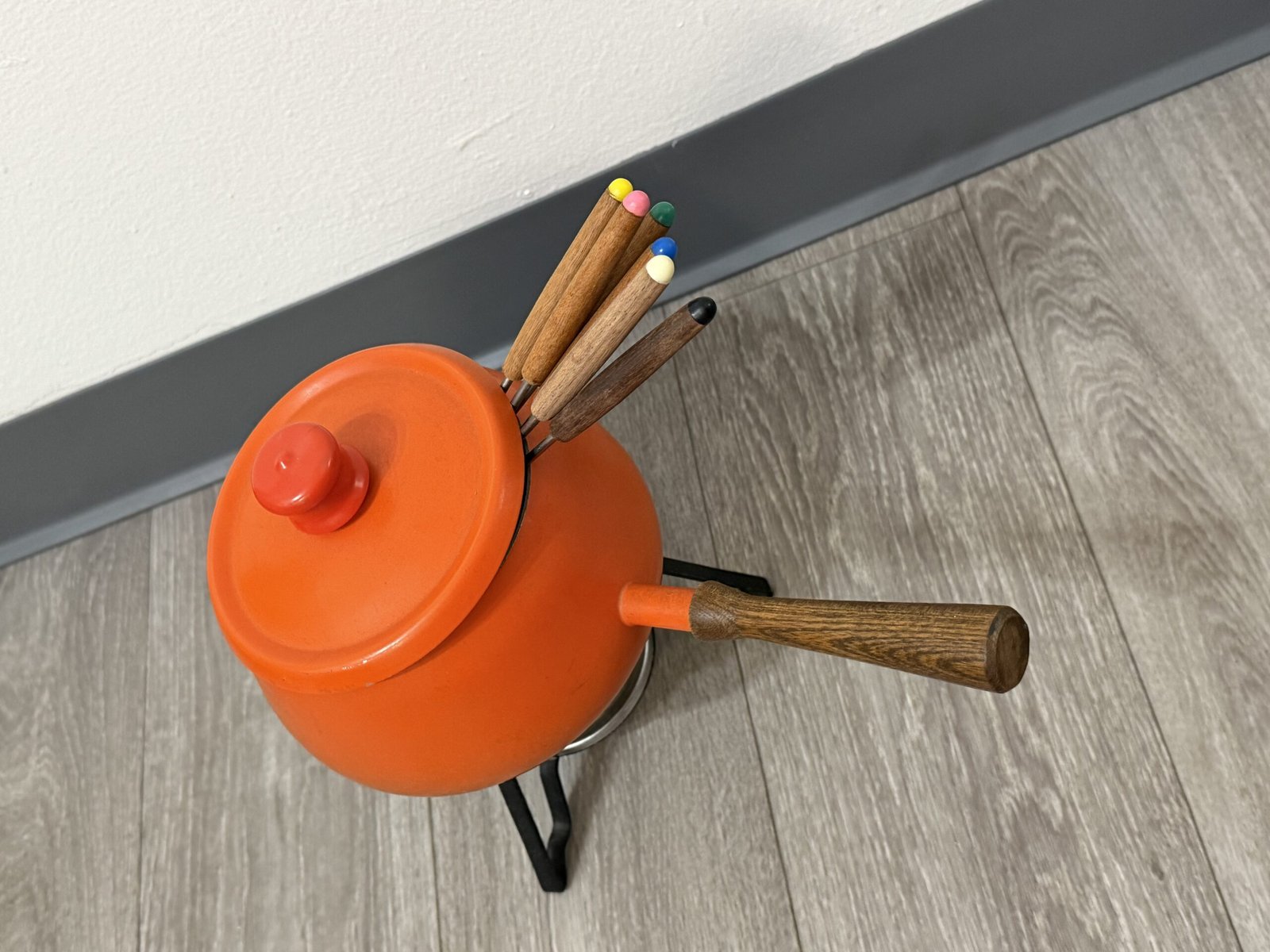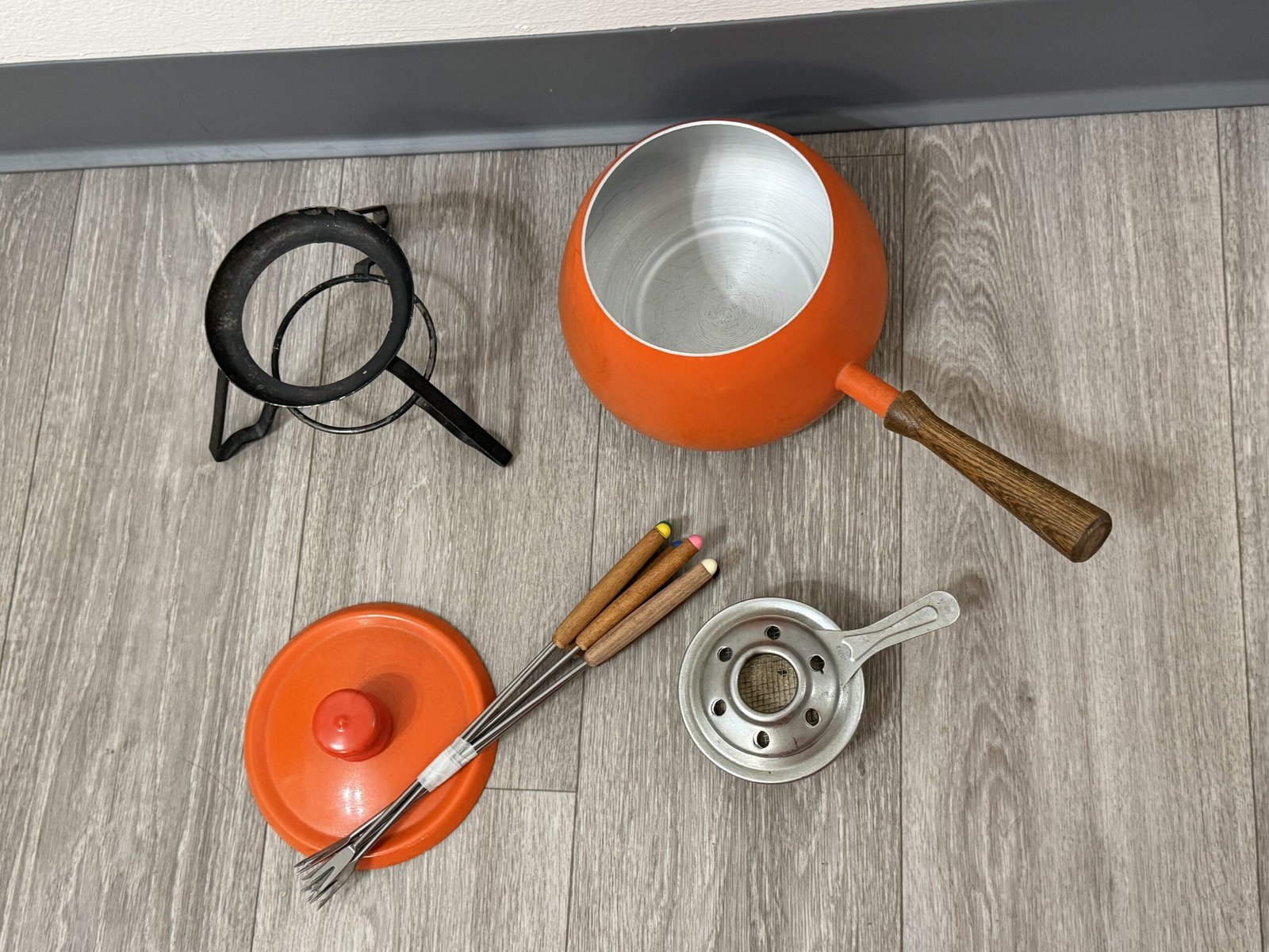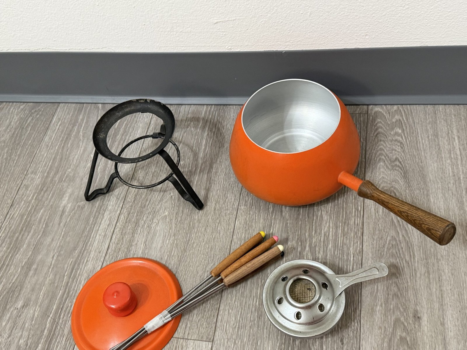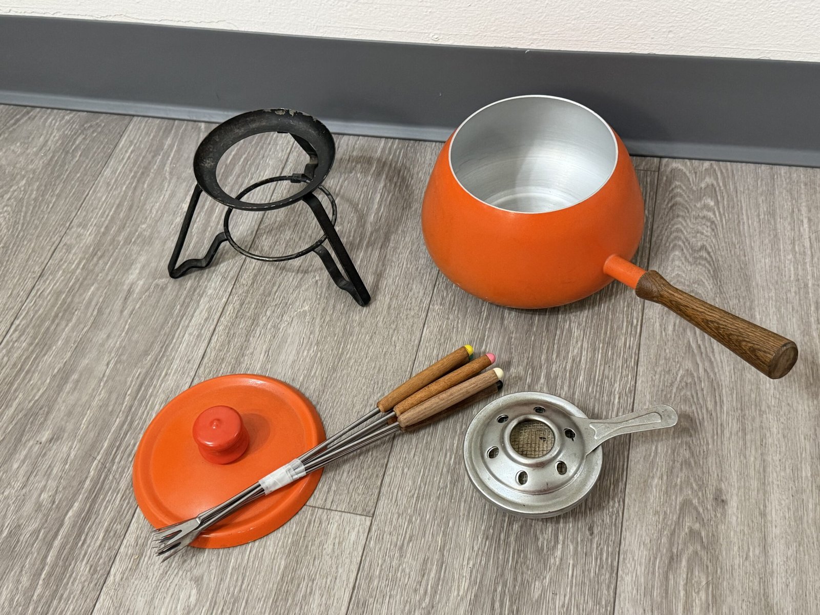 1960s orange enamel fondue set with forks and burner; inner rim is razor sharp and can cut—handle carefully.