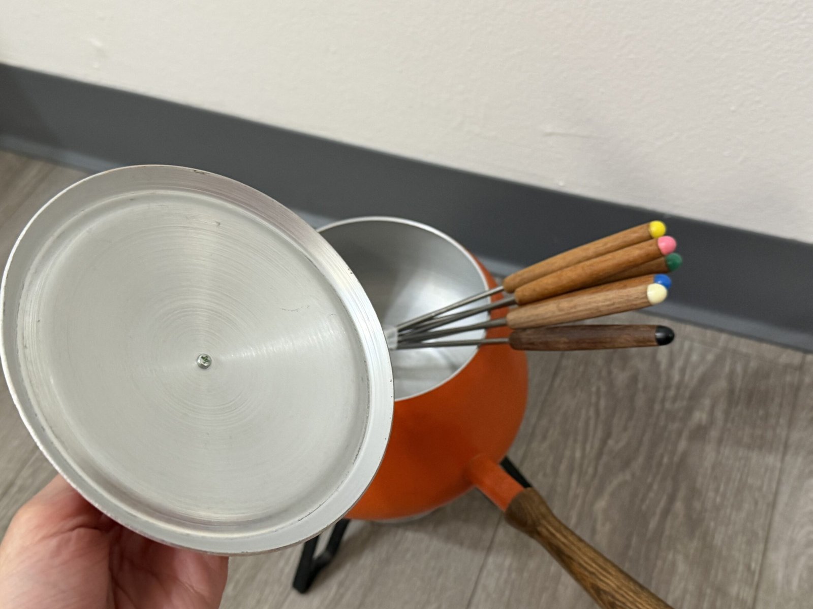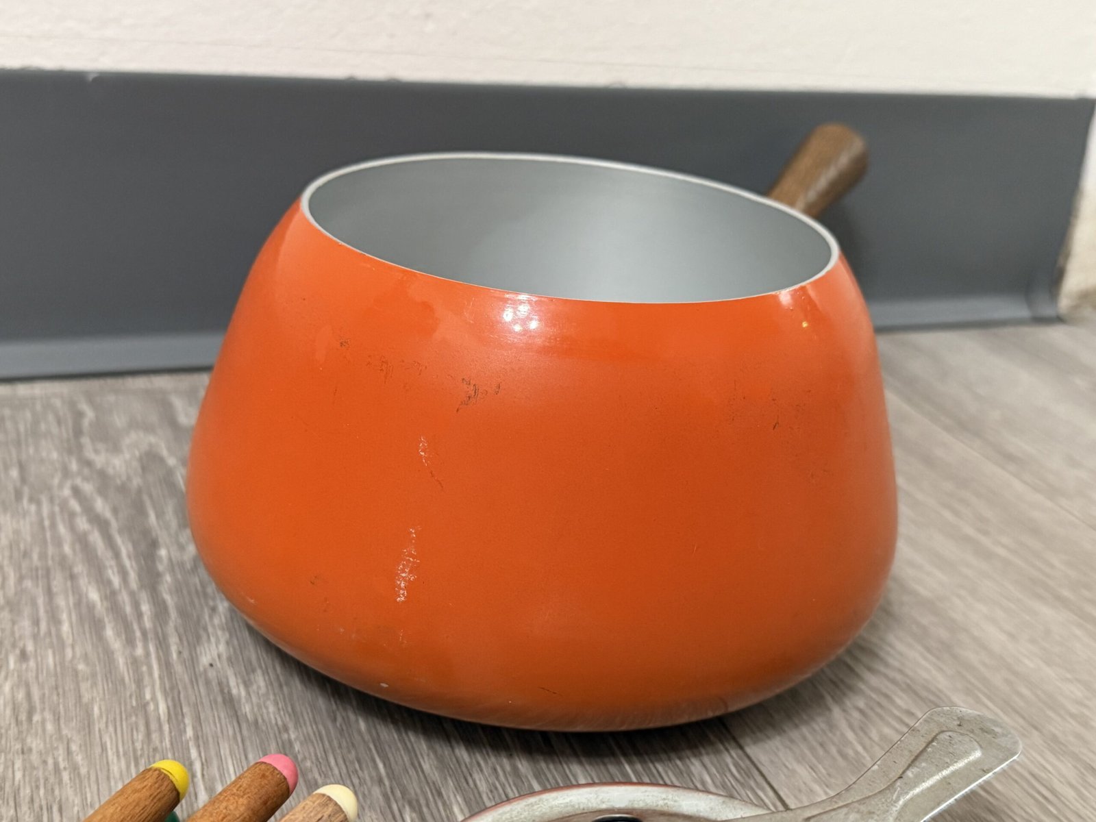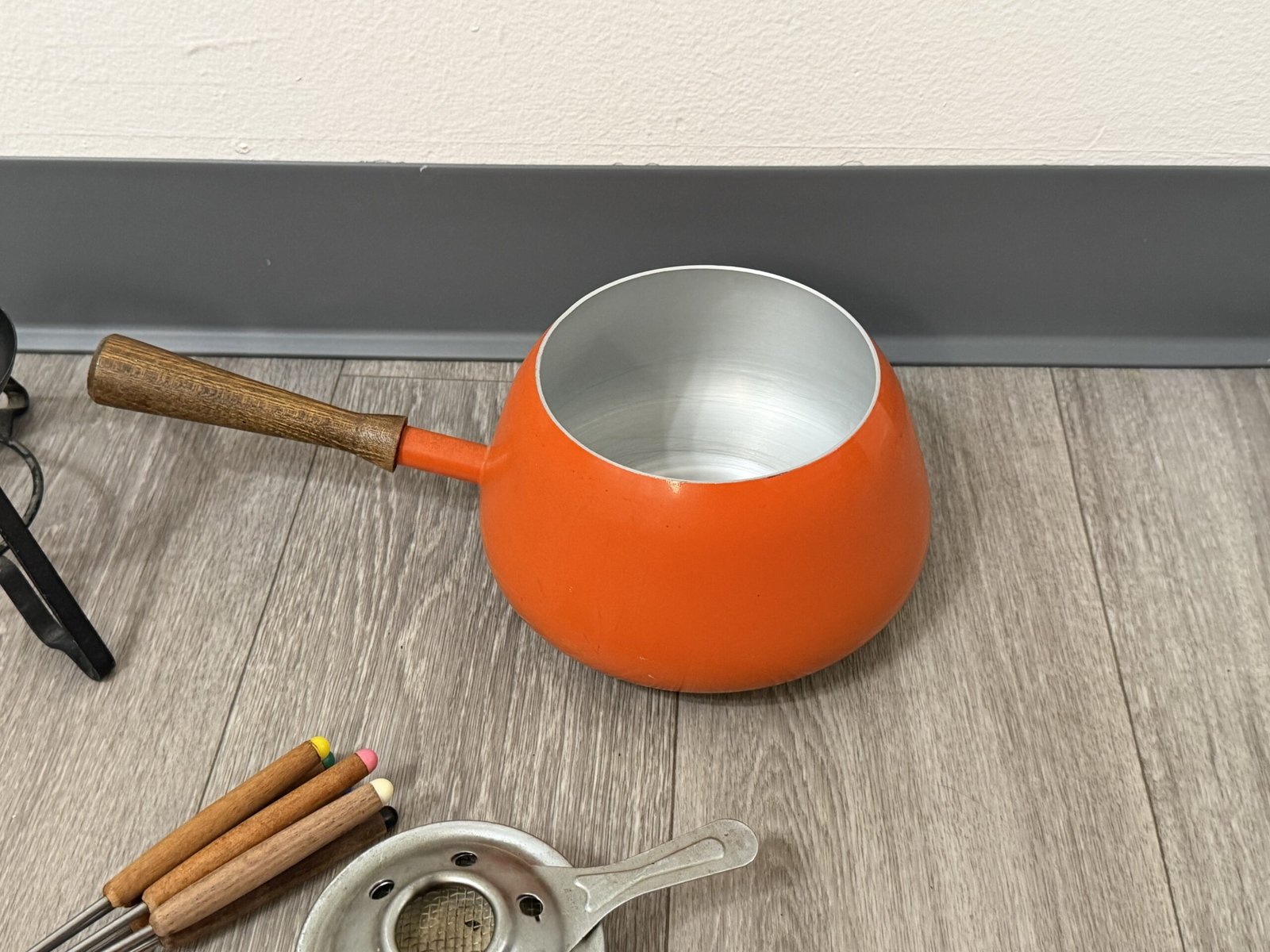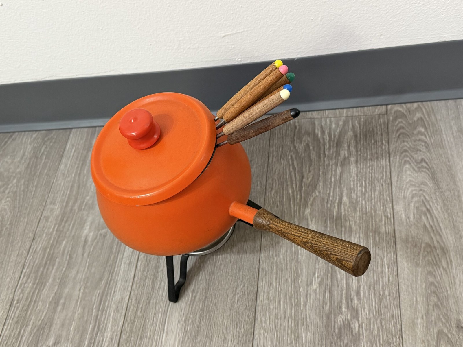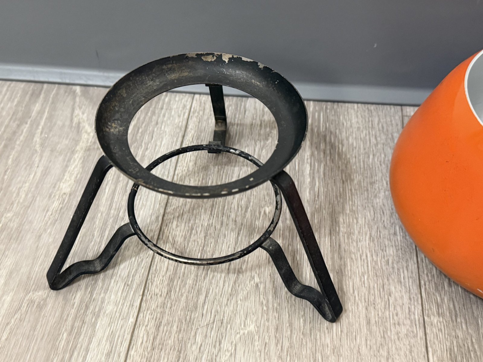 1960s orange enamel fondue set with forks and burner; inner rim is razor sharp and can cut—handle carefully.