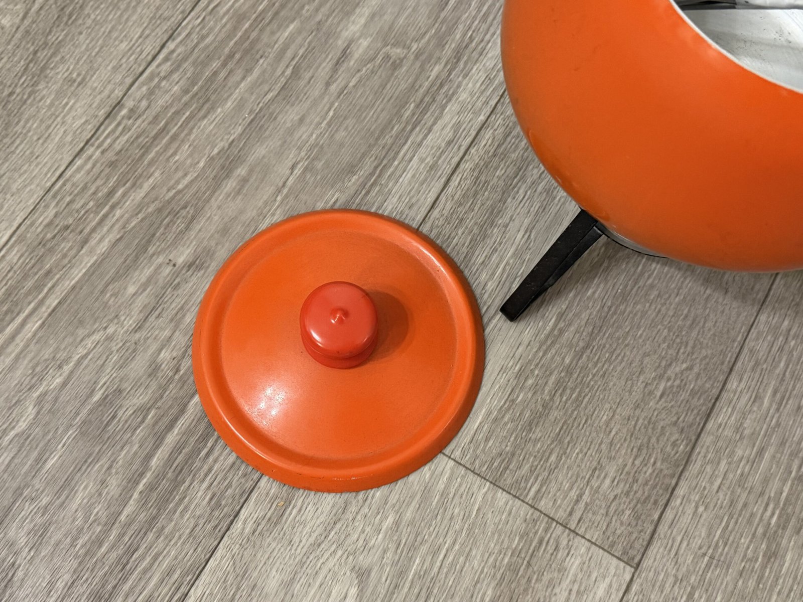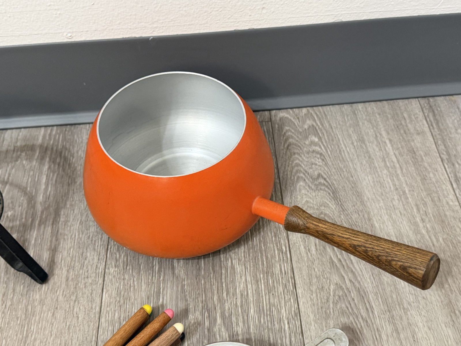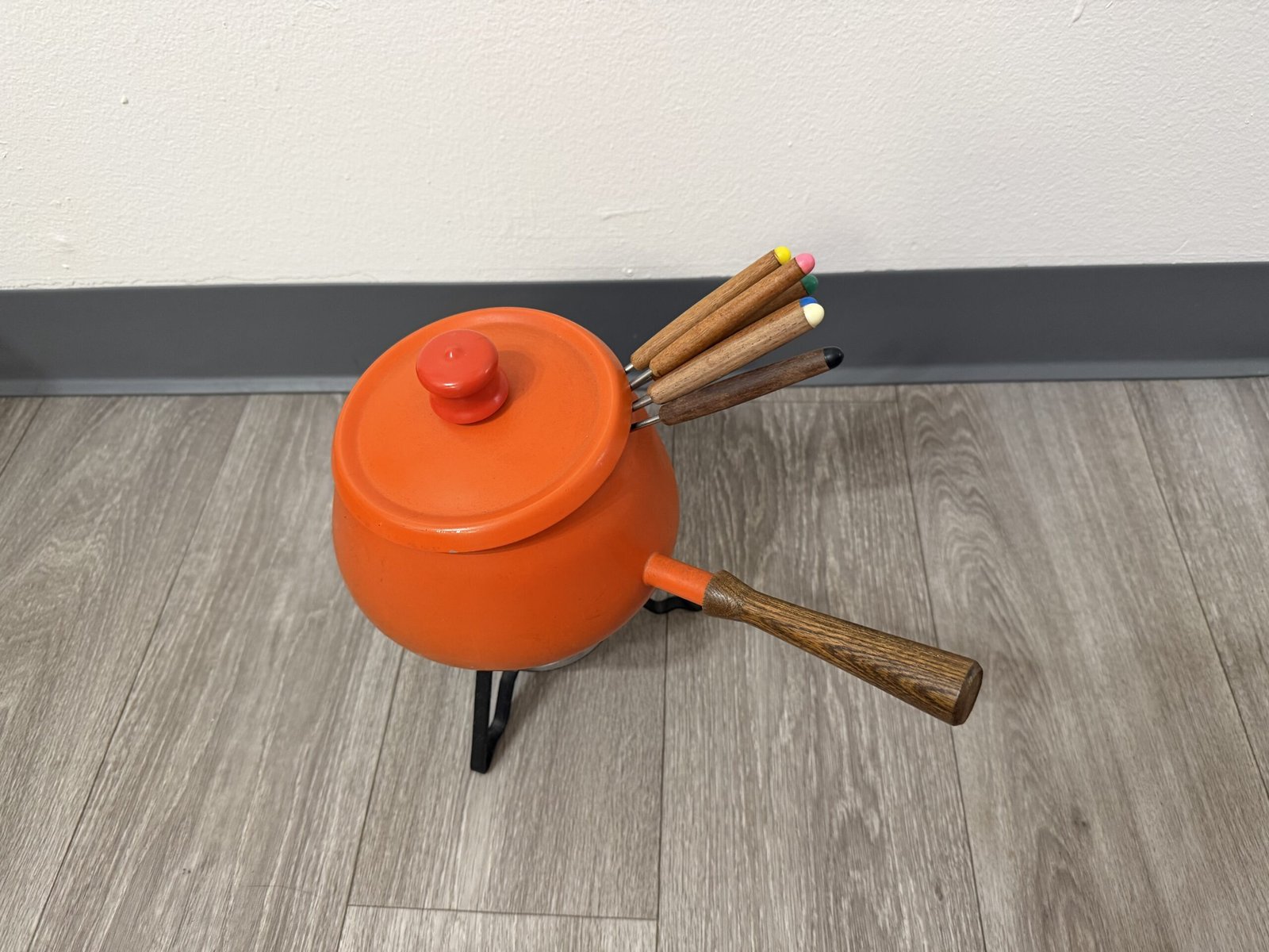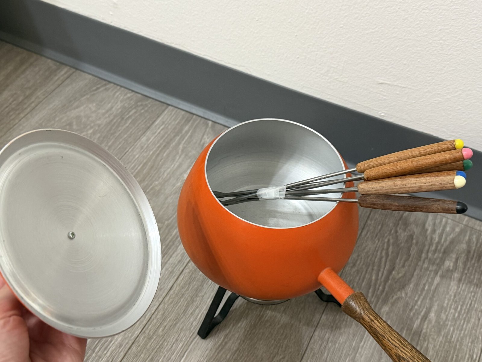 1960s orange enamel fondue set with forks and burner; inner rim is razor sharp and can cut—handle carefully.