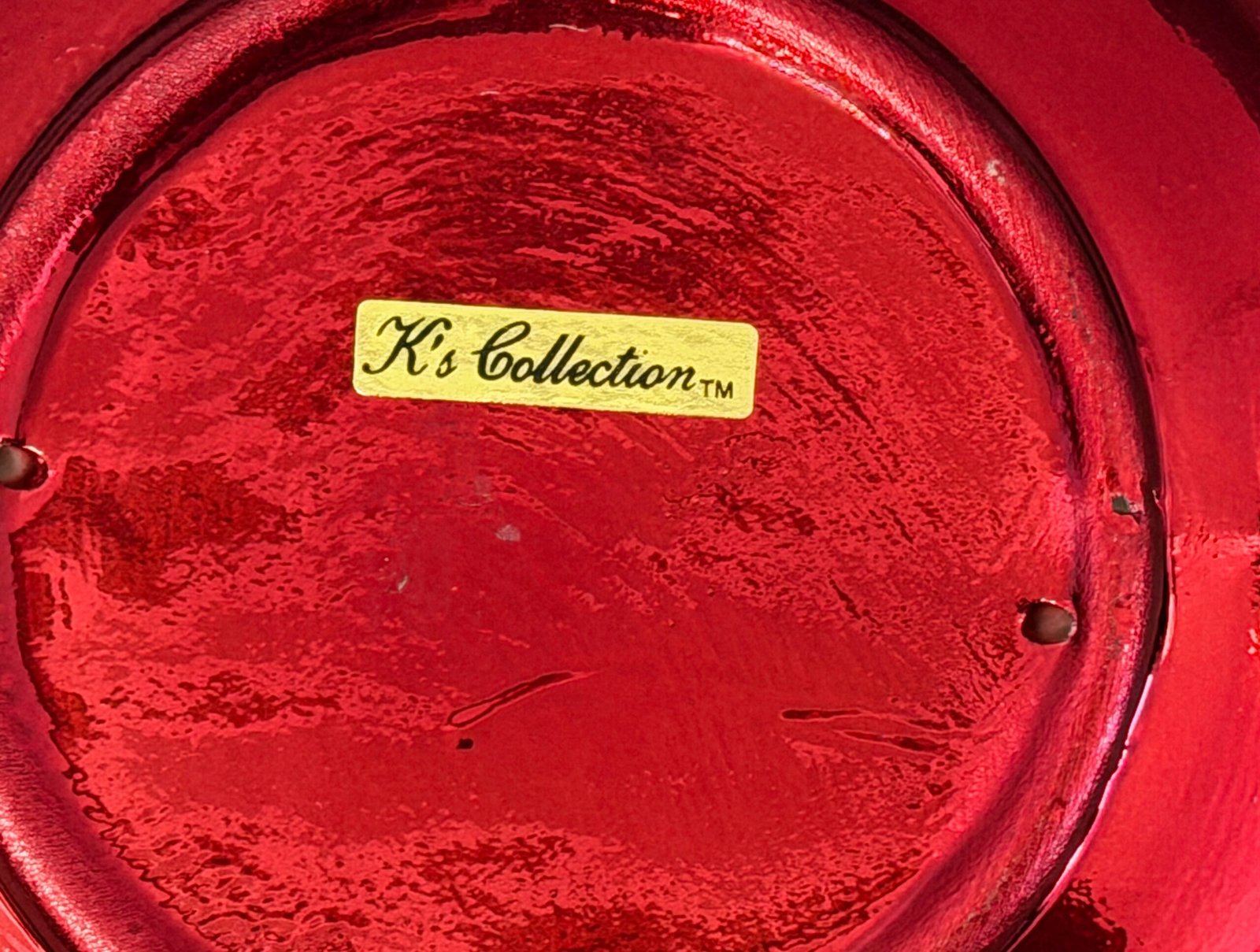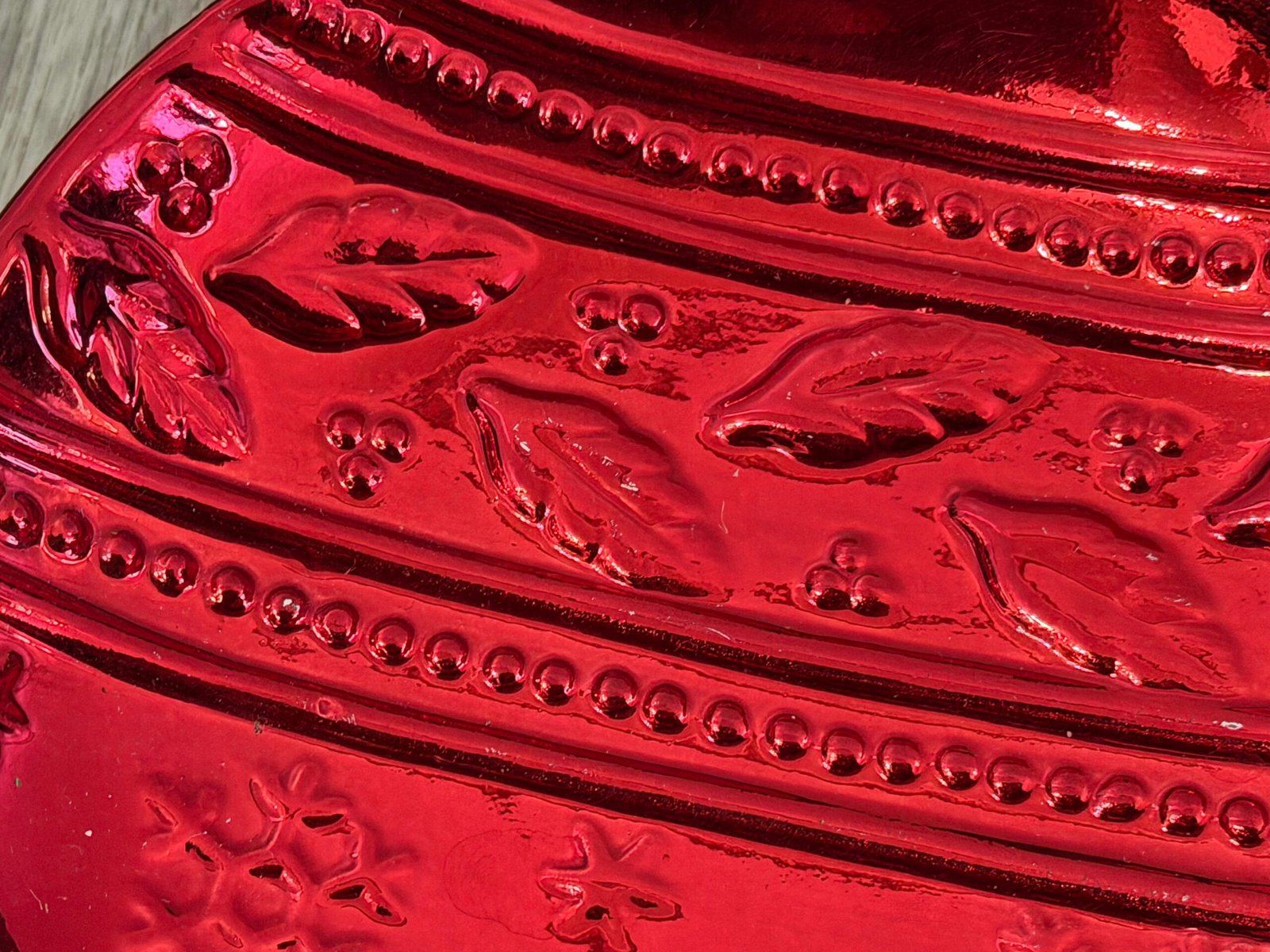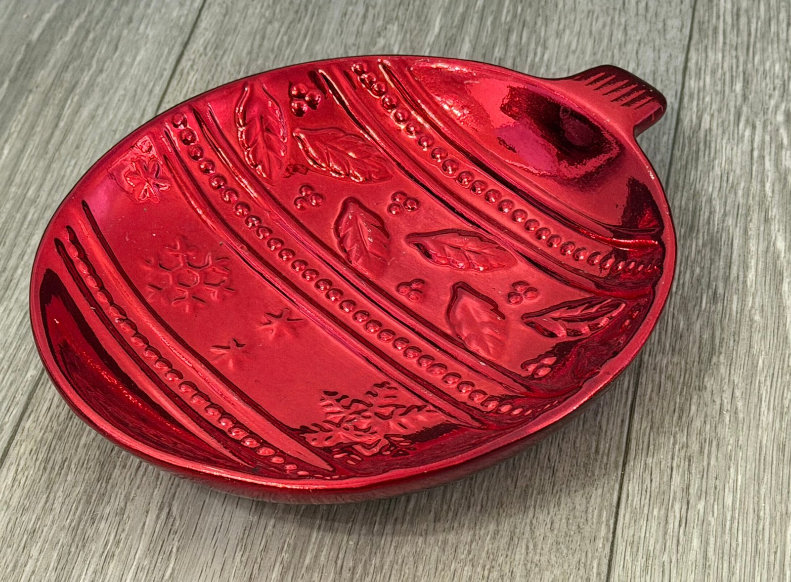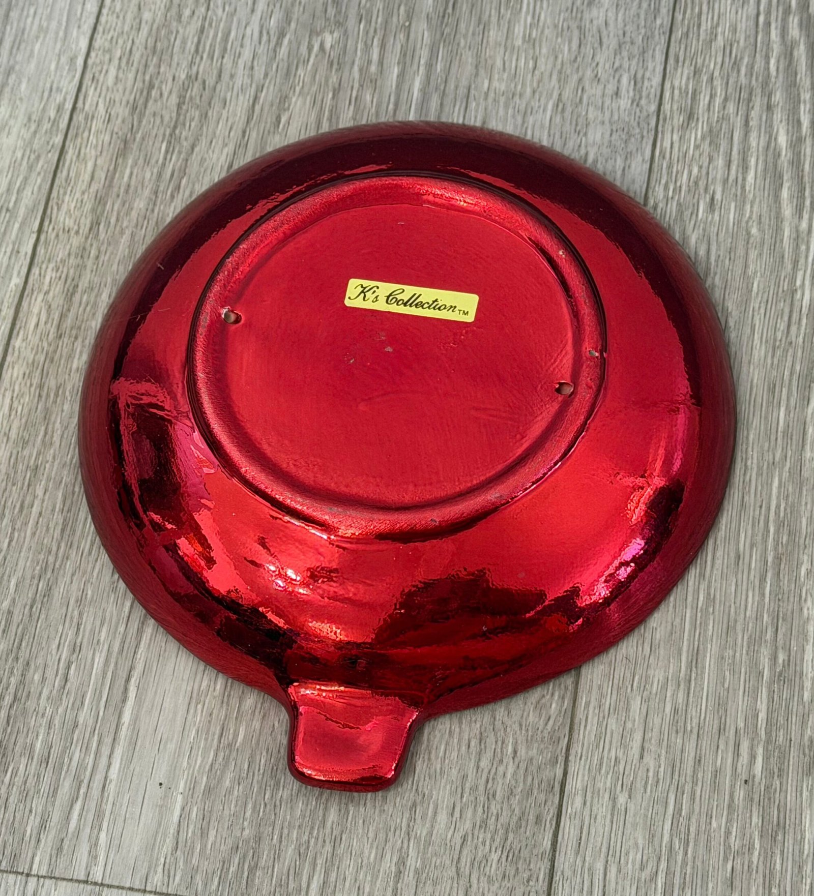 Vintage 1990s K’s Collection red ornament‑style serving bowl with embossed holly leaves, berries, and swirling details in a glossy metallic finish. Measures about 7″ wide with a top handle, perfect for candy, nuts, olives, or festive tabletop décor. Light wear shows small silver spots where the coating has thinned, adding authentic vintage patina. No chips, dents, or cracks. K’s Collection sticker remains on the base. Lightweight metallic composite and holiday‑ready.