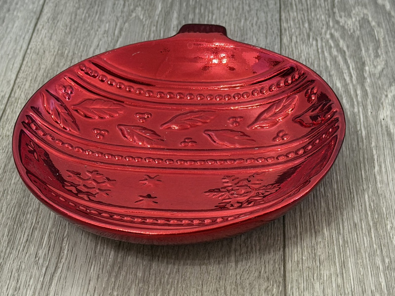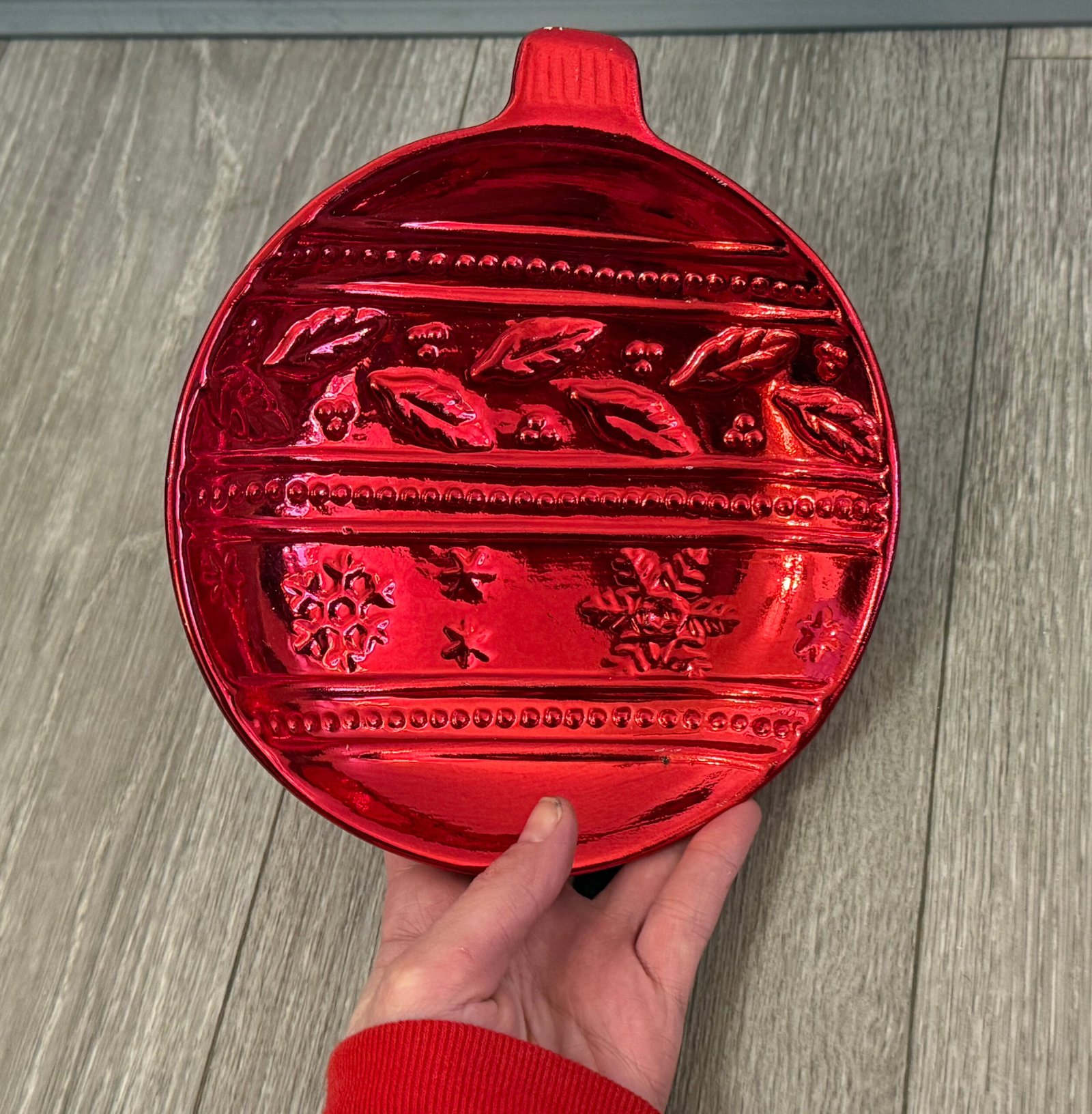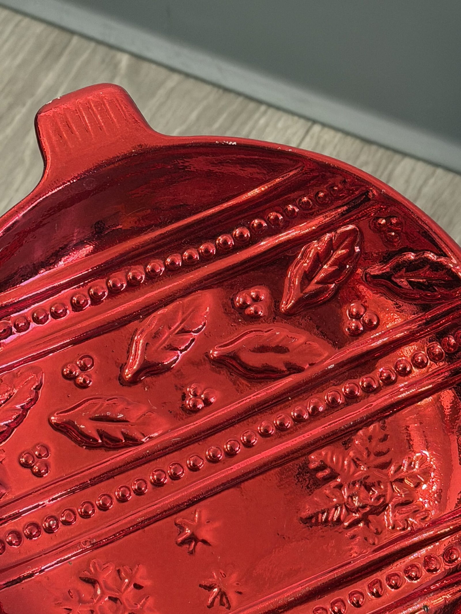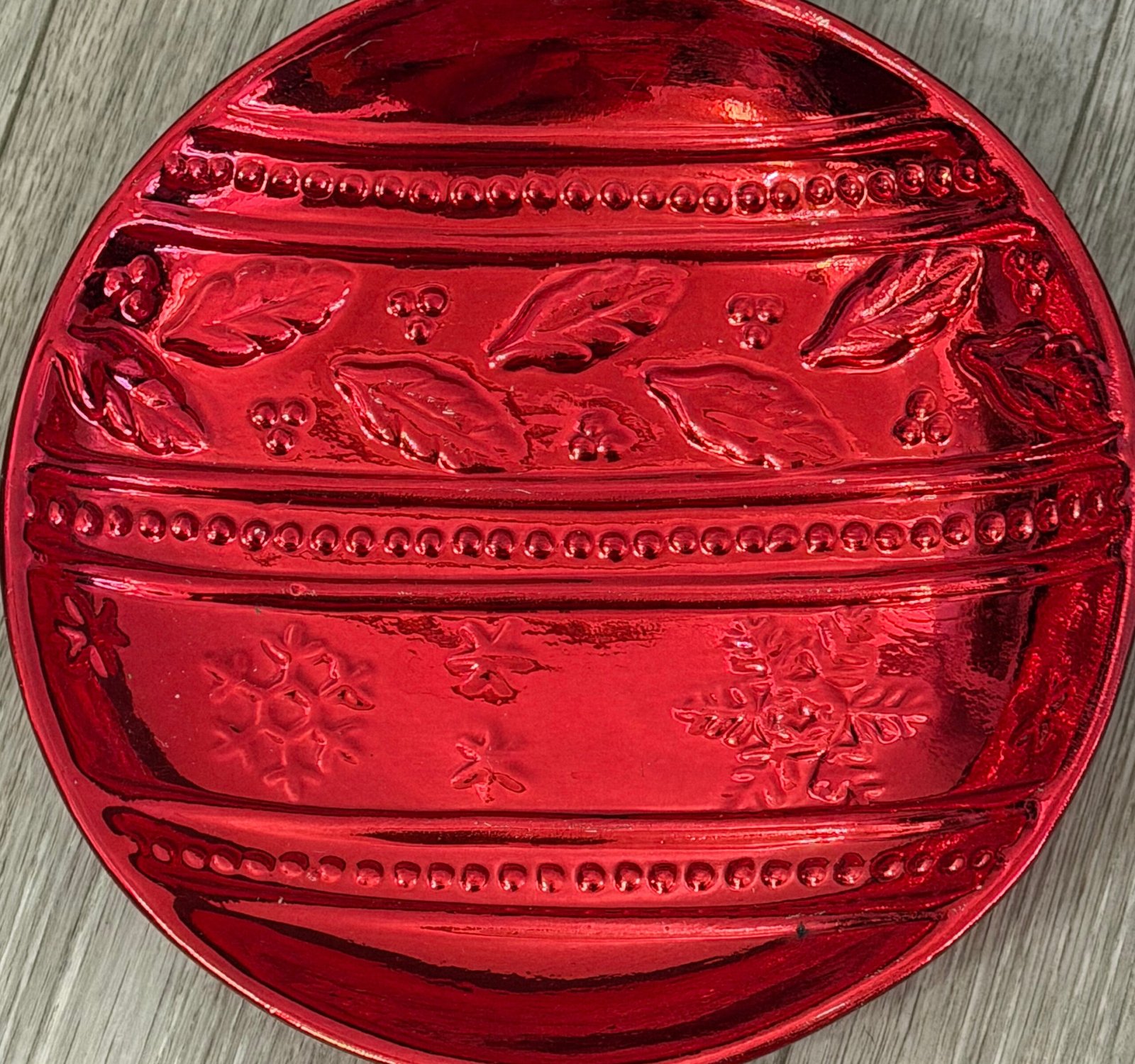Vintage 1990s K’s Collection red ornament‑style serving bowl with embossed holly leaves, berries, and swirling details in a glossy metallic finish. Measures about 7″ wide with a top handle, perfect for candy, nuts, olives, or festive tabletop décor. Light wear shows small silver spots where the coating has thinned, adding authentic vintage patina. No chips, dents, or cracks. K’s Collection sticker remains on the base. Lightweight metallic composite and holiday‑ready.