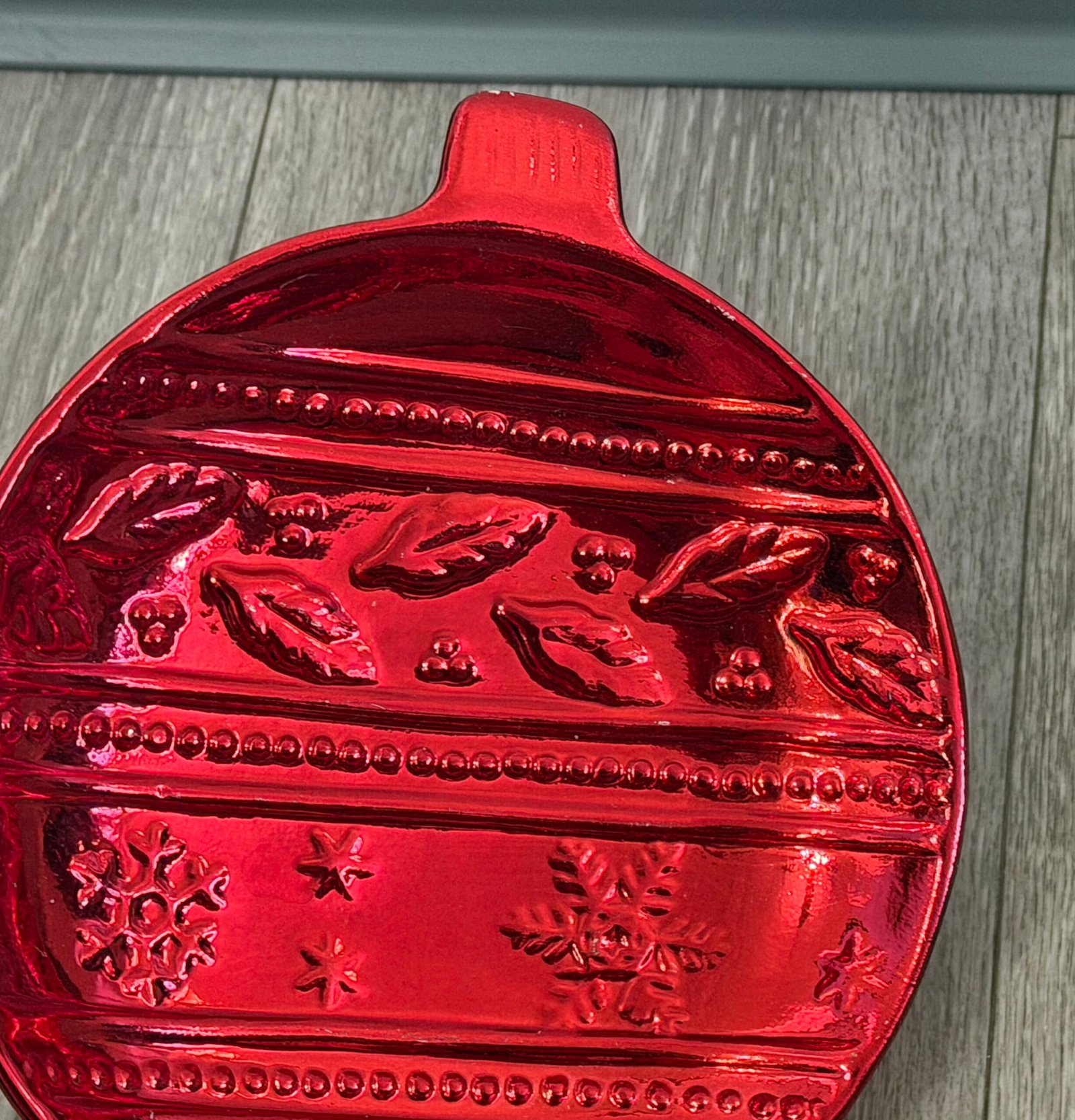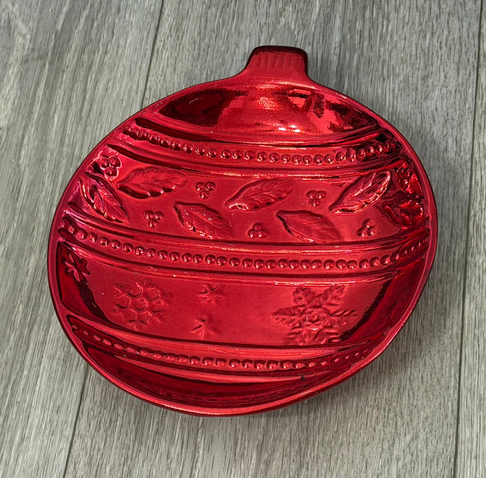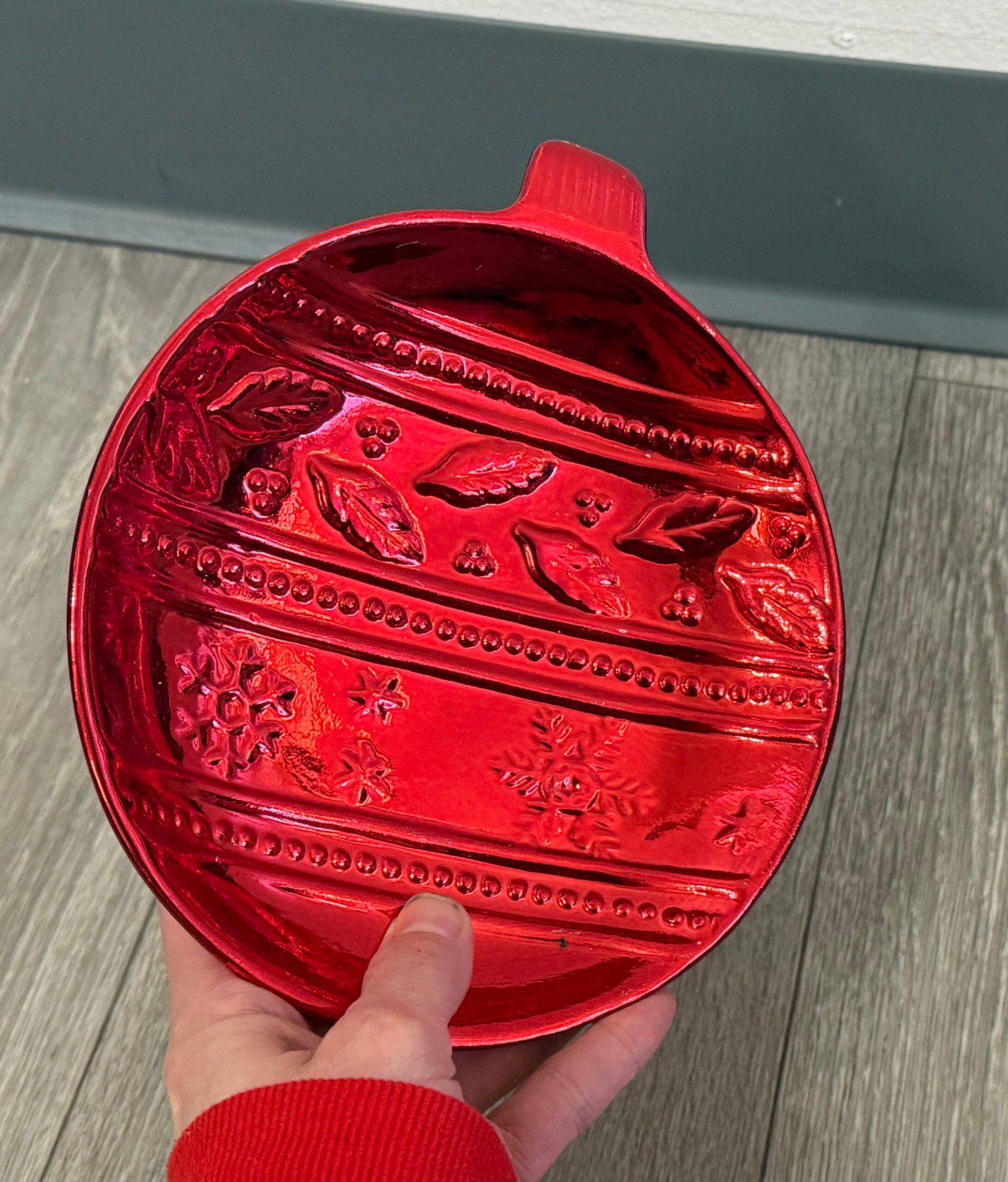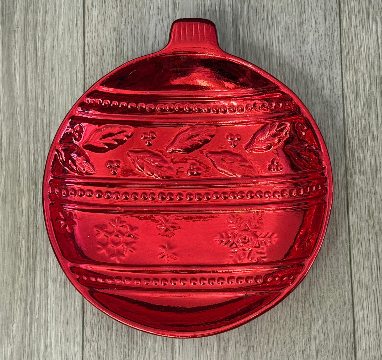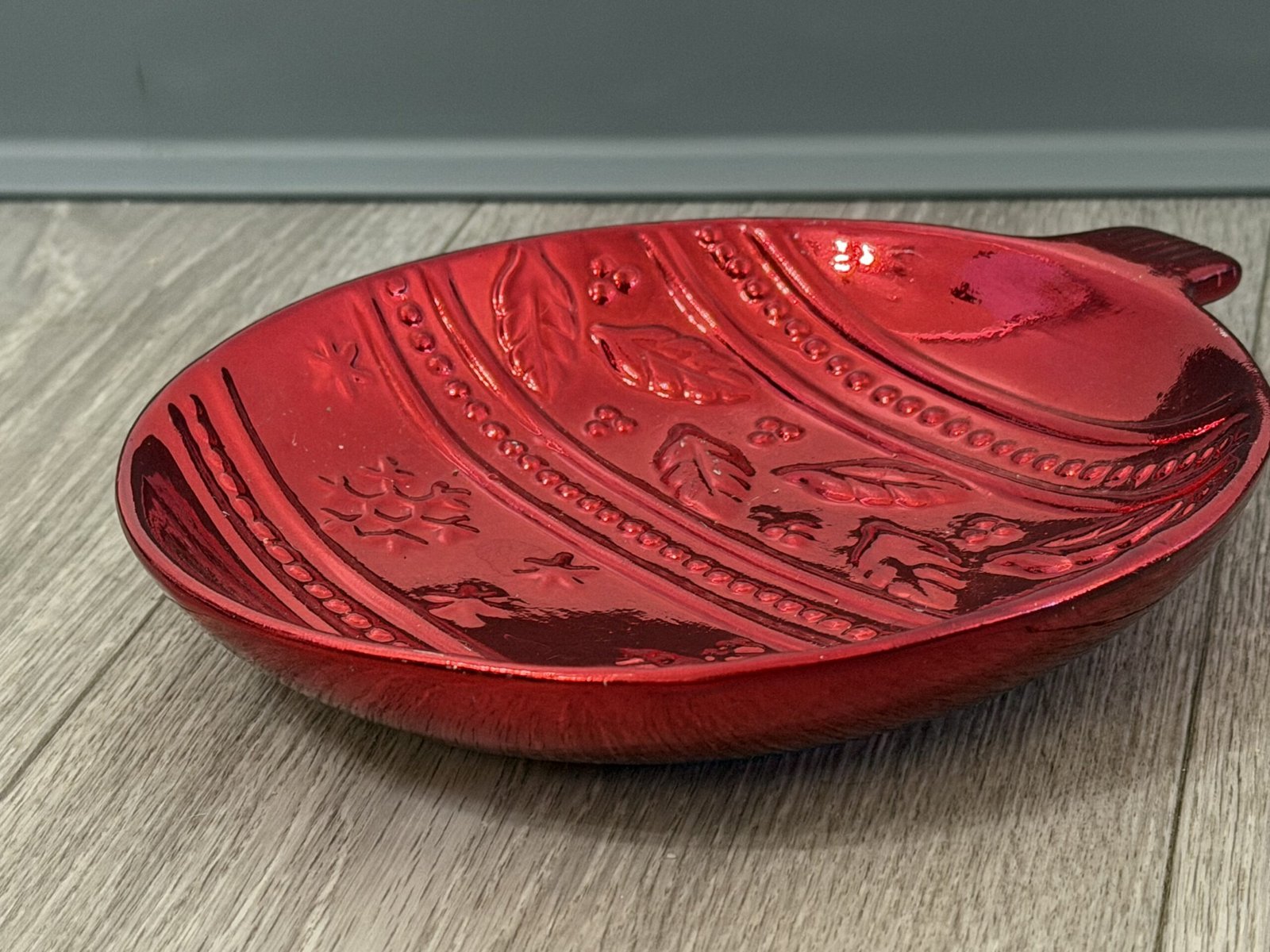 Vintage 1990s K’s Collection red ornament‑style serving bowl with embossed holly leaves, berries, and swirling details in a glossy metallic finish. Measures about 7″ wide with a top handle, perfect for candy, nuts, olives, or festive tabletop décor. Light wear shows small silver spots where the coating has thinned, adding authentic vintage patina. No chips, dents, or cracks. K’s Collection sticker remains on the base. Lightweight metallic composite and holiday‑ready.