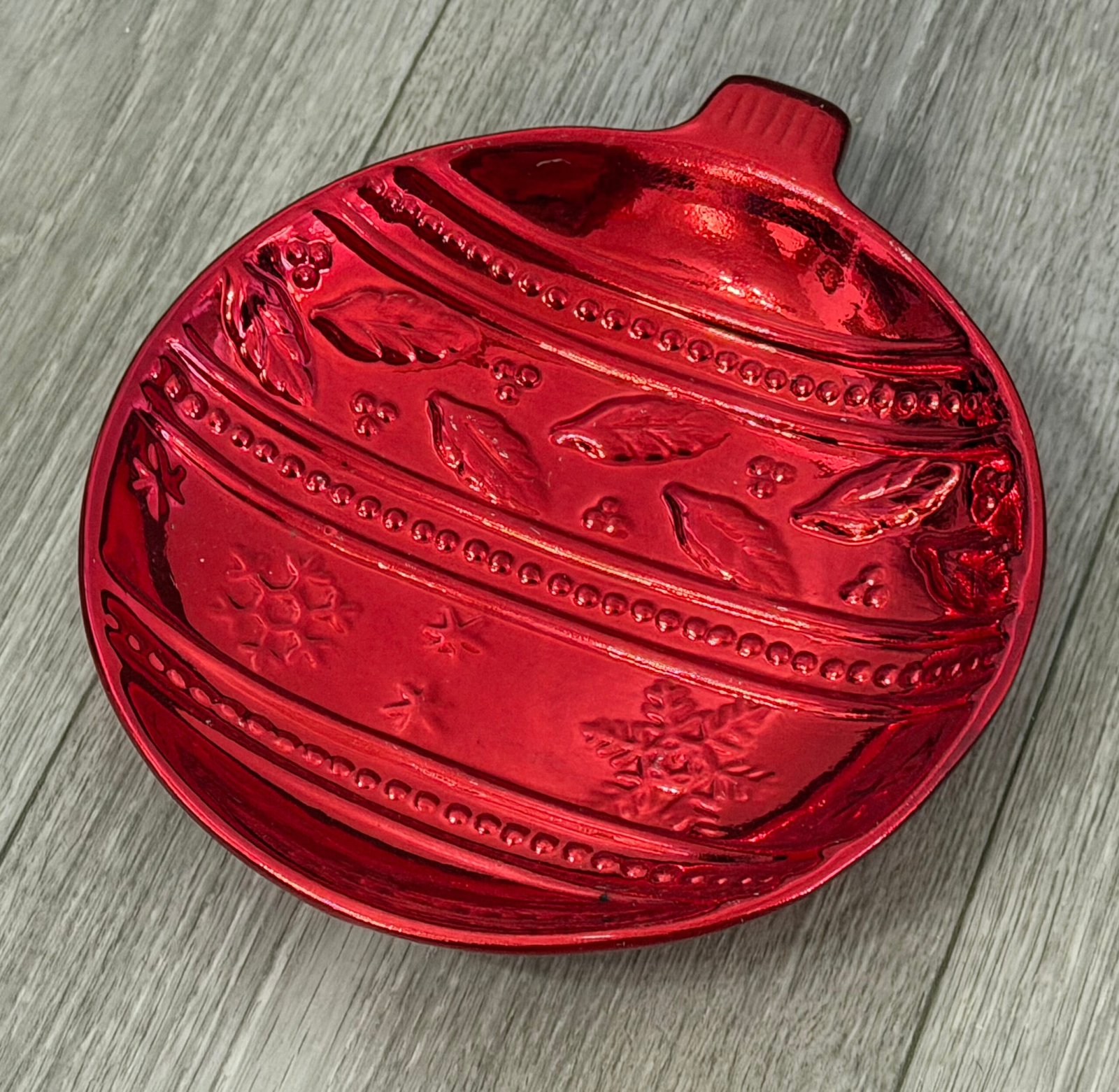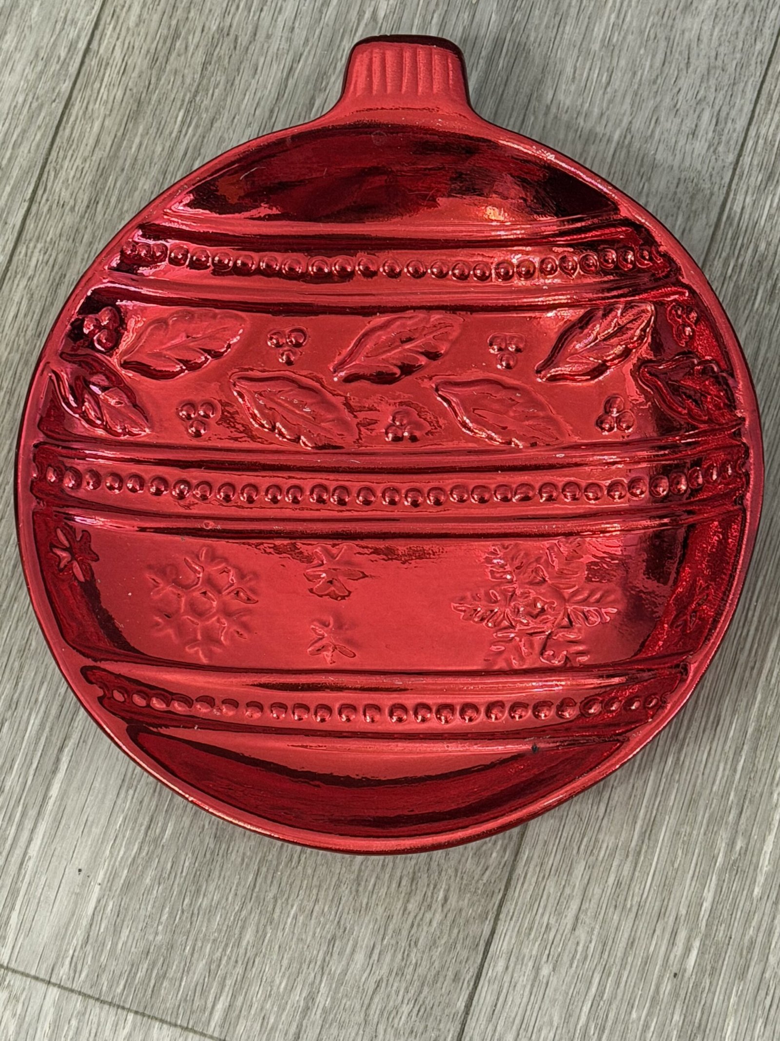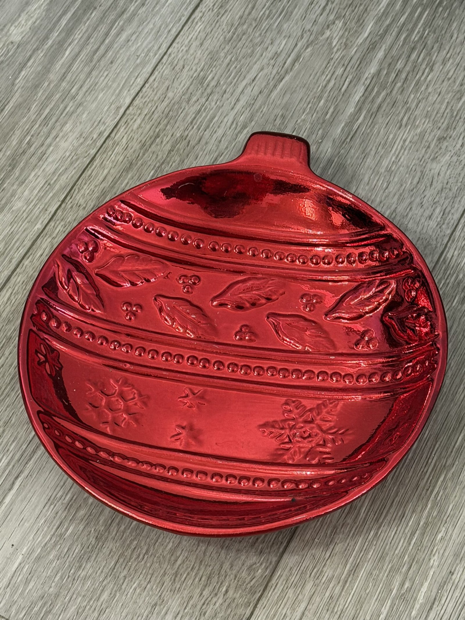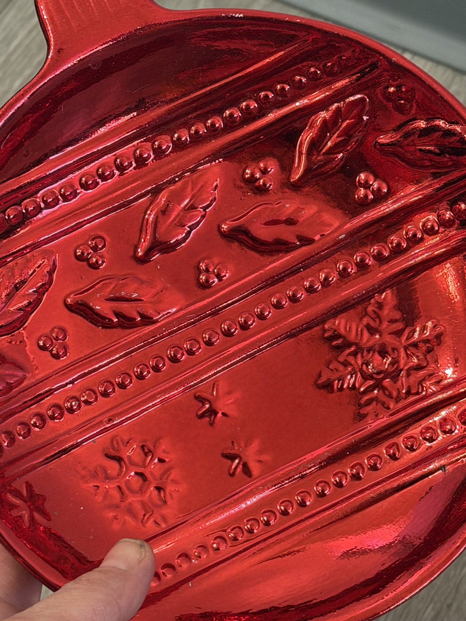 Vintage 1990s K’s Collection red ornament‑style serving bowl with embossed holly leaves, berries, and swirling details in a glossy metallic finish. Measures about 7″ wide with a top handle, perfect for candy, nuts, olives, or festive tabletop décor. Light wear shows small silver spots where the coating has thinned, adding authentic vintage patina. No chips, dents, or cracks. K’s Collection sticker remains on the base. Lightweight metallic composite and holiday‑ready.