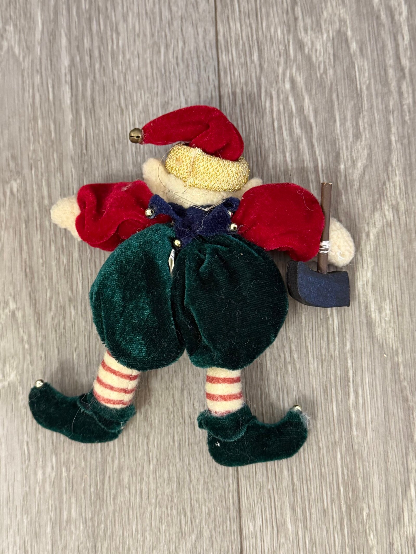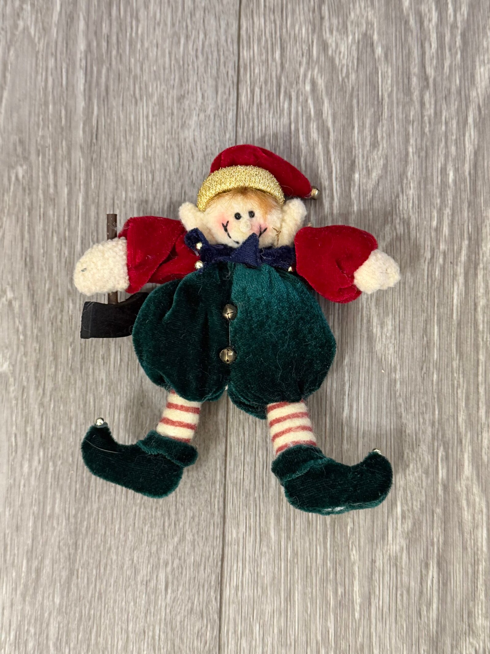 Add a touch of festive whimsy to your tree or tabletop with this vintage-style plush elf ornament, dressed in classic holiday colors with charming details. From his red velvet hat trimmed in gold to his curled green shoes with tiny bells, this cheerful elf brings nostalgic joy to any Christmas scene. His stitched smile and striped legs evoke mid-century charm, perfect for collectors and vintage lovers alike.